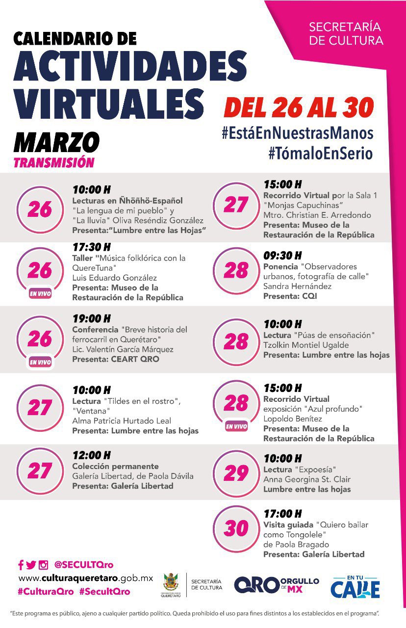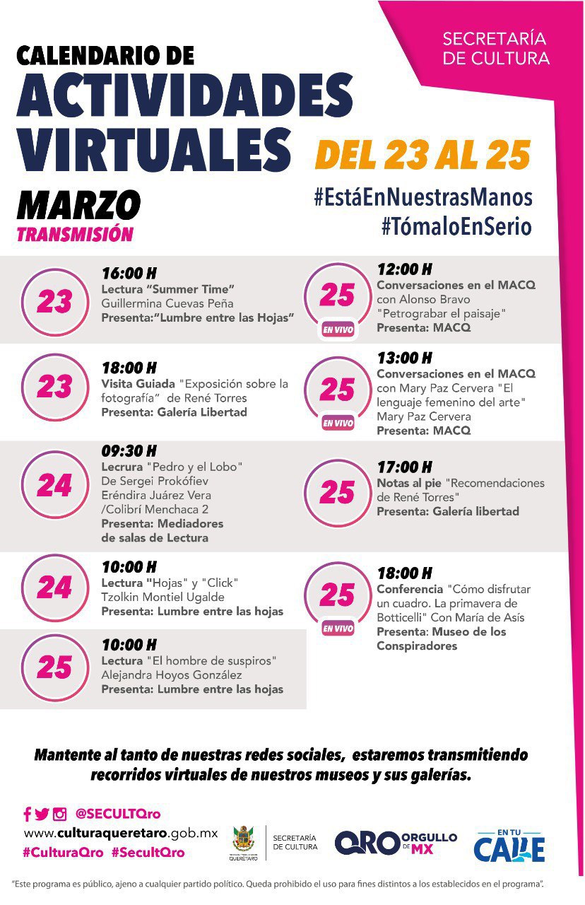 Las redes sociales en donde se puede consultar el programa son: Facebook: Secretaría de Cultura del Estado de Querétaro